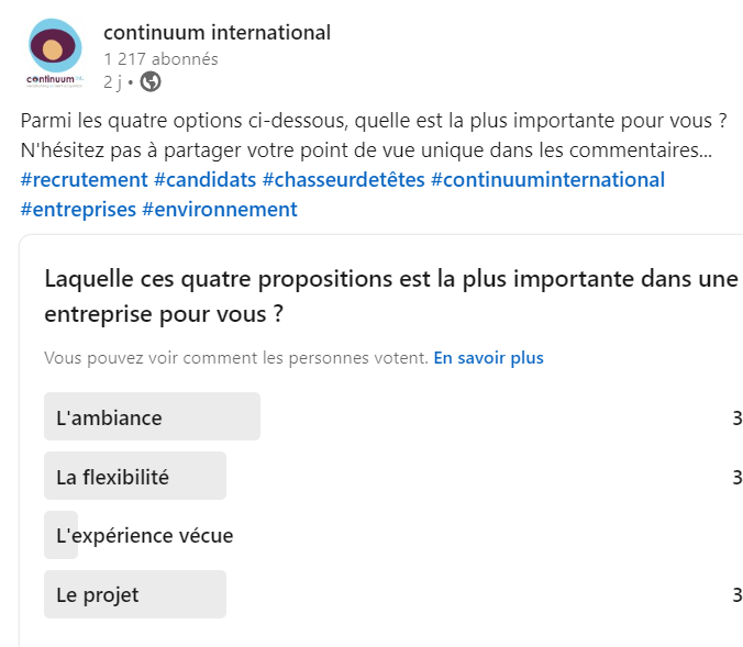continuum international est un cabinet de chasse de têtes et de gestion de carrières. Nos consultants sont experts de la chasse de têtes. Dotés d’une orientation très terrain, ils sont en permanence focalisés sur votre projet de recrutement et de développement.